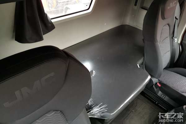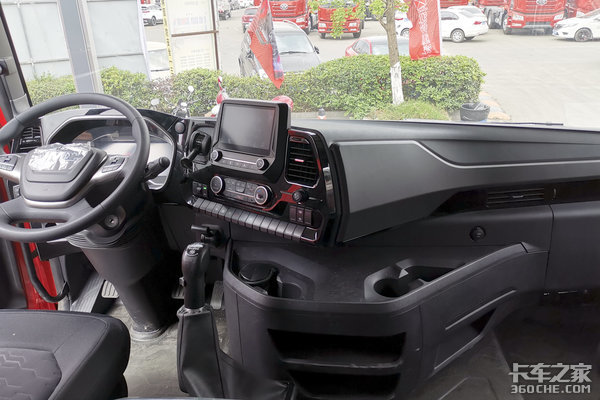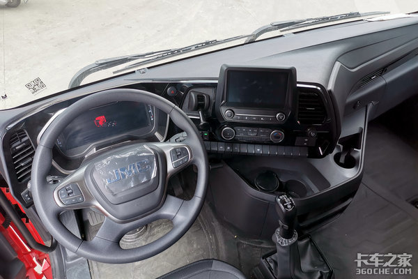 目前市场中主流的高端重卡基本都采用高顶平地板驾驶室,江铃威龙HV5也不例外。进入车内,2500mm宽度和2130内高带来最直接的感受就是宽敞,驾驶员可以轻松在驾驶室内直立行走、休息放松。另外,该车将主车和挂车断气刹设计到了中控区域,不仅方便驾驶员使用,同时还为车内留出了更多活动空间。