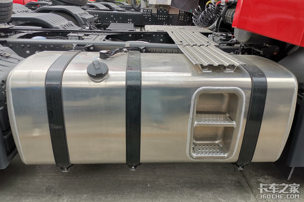 车辆右侧设有一个800升大尺寸铝合金油箱,并将蹬车梯集成到了油箱上,便于司机上下车,很人性化的设计。