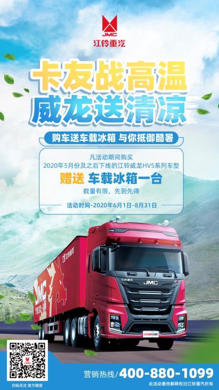 “卡友战高温 威龙送清凉”活动即将开始。凡活动期间购买江铃威龙HV5系列车型,将赠送车载冰箱一台。数量有限,先到先得!
