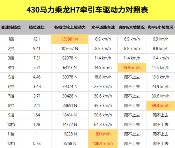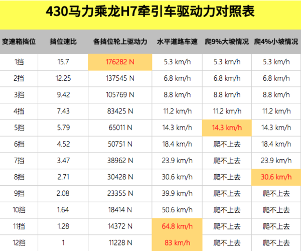 从扭矩分布图看得出来,该车头挡扭矩将近18万牛米,最高挡经济车速可达89.9km/h(1300经济转速),次高挡经济车速为70.2km/h,对于一台430马力的车型来说,表现还算是不错的,但相对而言这样的扭矩配比还是更适合高速路段。