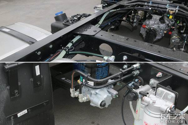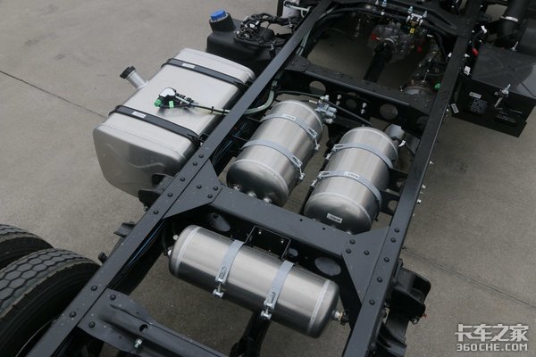 广泛采用轻量化零部件,除了变速箱以外,该车的燃油箱(80升)、储气筒均为铝合金材质。据经销商实测,该车底盘自重仅为2.2吨。