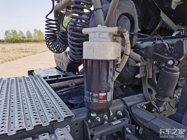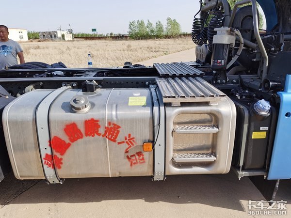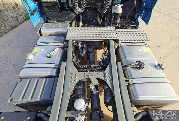 底盘除了动力链的两点以外,还有几个小亮点,一个是双油箱,并且是选装了寒区包。主油箱600L,副油箱400L,加起来就是1000L的超大油箱,续航能力可以达到3000公里以上,减少加油次数,还可以加不同标号的柴油,在冬天的时候不用担心柴油挂蜡没办法使用。