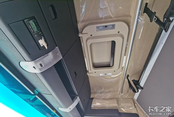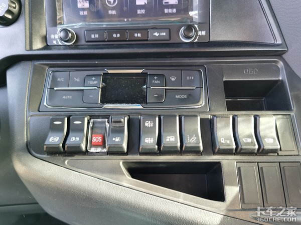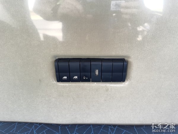 之前的汕德卡都是装配手动天窗,而超高顶驾驶室由于高度太高,手动天窗不太方便,所以升级为了电动天窗。就算是在开车的时候,也可以直接通过中控台上的按键开启天窗,特别是有抽烟习惯的卡友,在抽烟的时候打开天窗,这样就可以减少驾驶室内的烟味了。