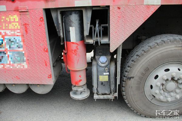 中间的第三桥为气囊提升桥并带有转向功能,能够减小转弯半径,也能使这一桥减少轮胎磨损。这样看来该车1、2、3轴都是转向轴。这一桥在法规上他能使这台车获得更大的吨位。