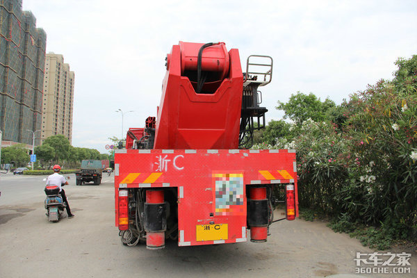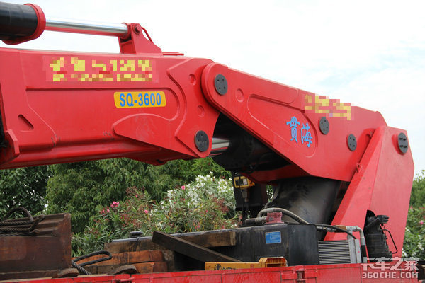 这是这台车的重头戏。随车吊上装厂家为江苏贯海重工,折叠臂型号为SQ-3600。粗壮的大臂及油缸,从粘贴的广告我们可以得知它最大可以进行100吨左右的吊装作业。