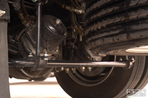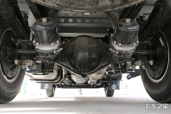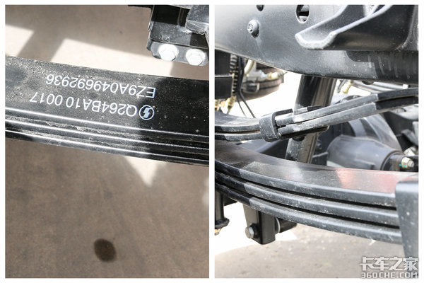 悬架方面,采用的是轻量化少片簧,前3后3+2的设计,可以有效帮助车身降重,在保证正常上牌的同时,也可以让用户在法规允许的范围内多装货。