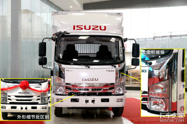 五十铃M100中体轻卡外形延续庆铃家族式设计,仍采用了双V型中网设计,该车配置较高,会在外形上有细微区别体现,实拍该车型采用大面积的镀铬饰板,更显经典、时尚、大气。另外,大面积的镀铬在夜间也有很好的反光识别效果。