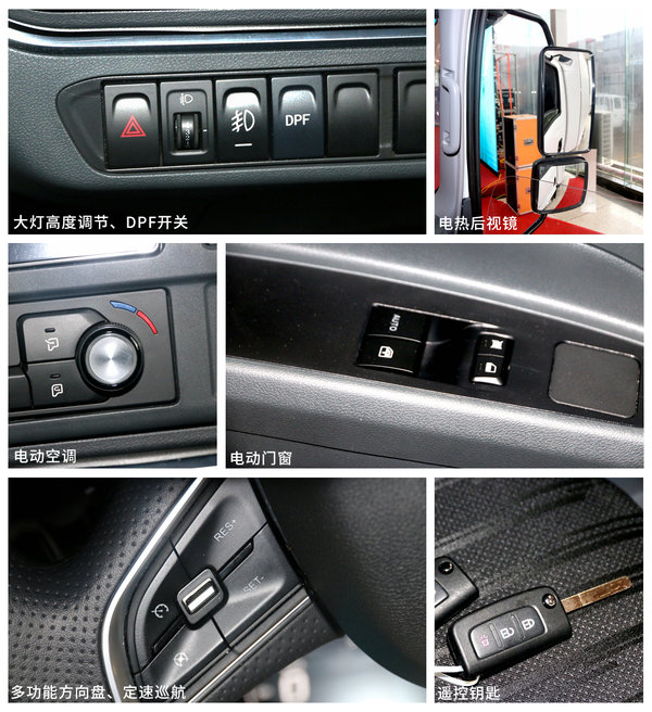 在配置上,实拍这款M100标配中控锁、电动门窗、电动空调、遥控钥匙、定速巡航、电加热后视镜等,配置丰富,在同级别轻卡里属于中上的水准。