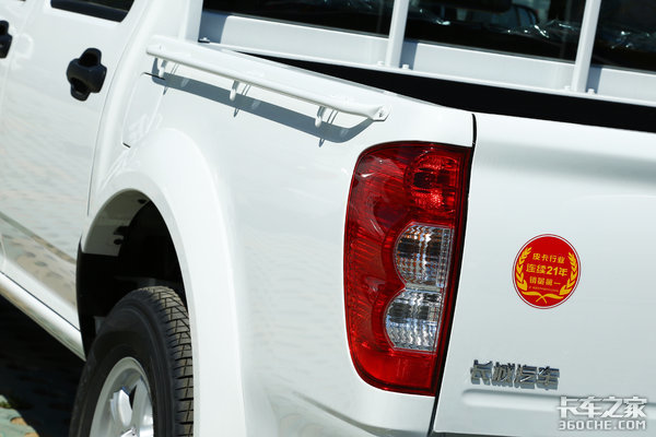 尾灯造型较为圆润,与车身搭配的不错。货箱外部的横杆上安放了挂钩,可以为捆绑绳提供丰富的捆绑锚点。