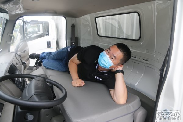 此外驾驶室内部还可形成一个单人卧铺,并且换挡杆也并不碍事,卧铺整体长度可达2米,足够为卡友提供一个舒适的休息空间。