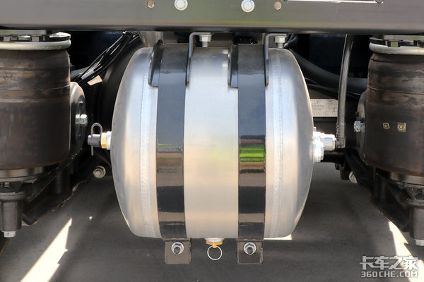 车架后方能够看到“搬了家的”储气筒,材质同为铝合金,其实将储气筒后移是目前大多数国六重卡的惯用手法,整体表现中规中矩。