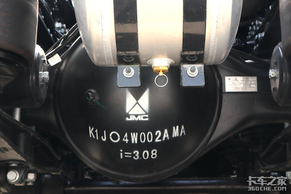 后桥部分,这台江铃威龙HV5匹配的是江铃自主的高承载力后桥,速比为3.08。此时可计算出该车的全车总速比为2.55,这个速比应对高速标载物流还是非常游刃有余的。