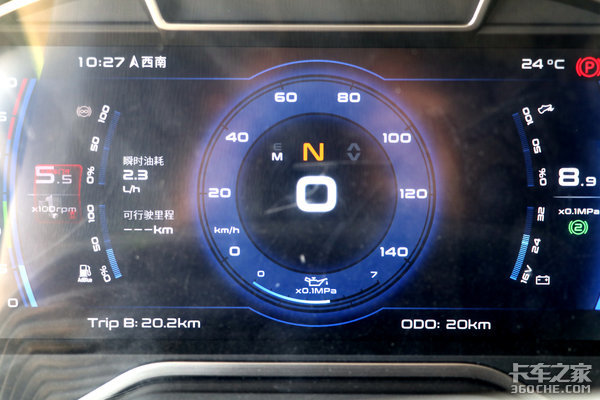 全液晶仪表为江铃重汽自主设计的界面,整体的画面流畅度、显示清晰度和车内光线较强时的观察感优化的都很好,显示信息也较为丰富,有效增强了驾驶室内的科技感。