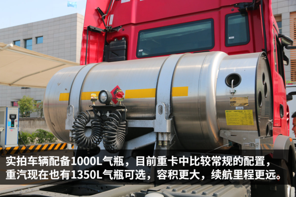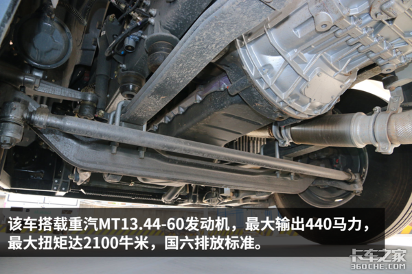 实拍车辆搭载重汽MT13.44-60燃气发动机,最大输出440马力,在1000-1400转时能爆发2100牛米的峰值扭矩,满足国六排放标准。相较于国五1900牛米的扭矩,该款发动机在最大扭矩上提升了200牛米,整体性更强,驾驶也要轻松不少。