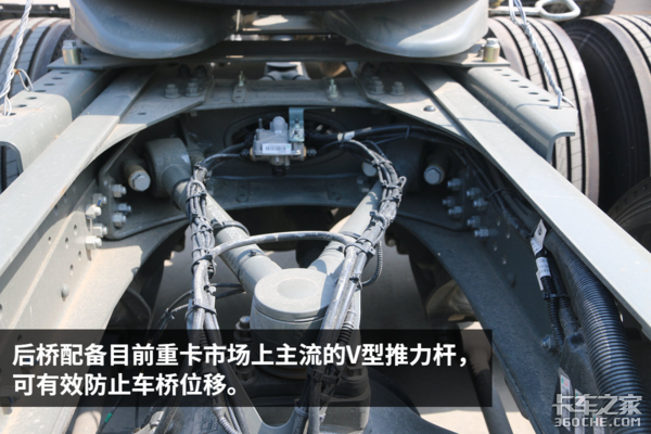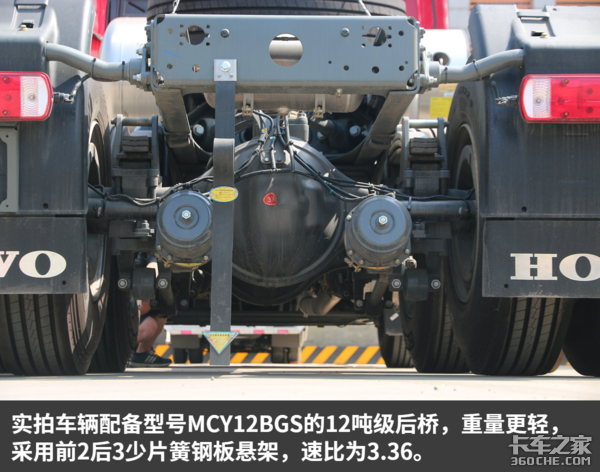 后桥是重汽最新的12吨级的单级减速桥,也是目前重汽不少车型的标配车桥。重量上和11吨级车桥差不多,承载力又可媲美13吨级产品,合理的兼顾了重量与承载力。