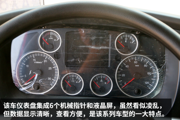 仪表盘采用多达6个机械指针+液晶屏组合,分别有时速、转速、水温、储气压力、电压以及燃气容量。中间液晶屏可显示更多行车信息,方便驾驶员读取。