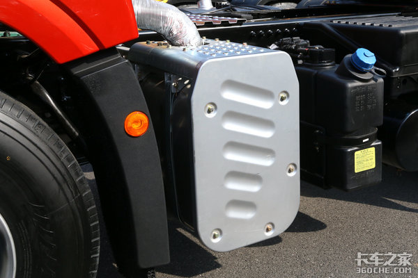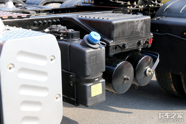 后处理后方为尿素罐和电瓶以及储气筒,对于4×2车型的底盘空间,这样的设计可以很好的节省底盘空间,使车身的另一侧空间留给油箱等其他配件。