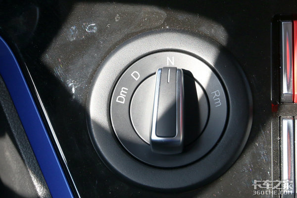 左侧的旋钮为AMT变速箱的选挡开关,D为前进挡、N为空挡、Dm为前进挡的蠕行模式、Rm为倒挡蠕行模式。其实设计蠕行模式的原因是因为AMT变速箱并不会像咱们传统的手动变速箱那样带有半联动,低速挪车时就需要使用蠕行模式进行操作。