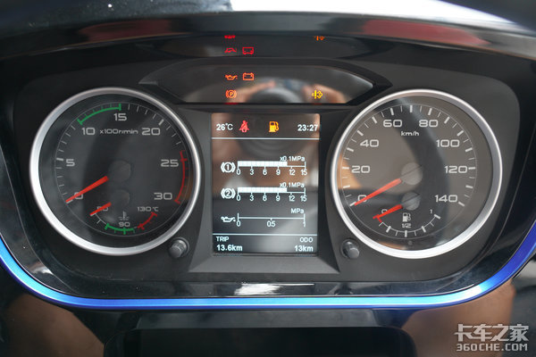 悍V2.0港拖版的仪表盘也使用了全新设计,中间集成了液晶显示屏能够显示更多的车辆信息,在调整仪表时需通过仪表下方的黑色按键进行调整,整体显示信息丰富,但调节方式还是需要加强。