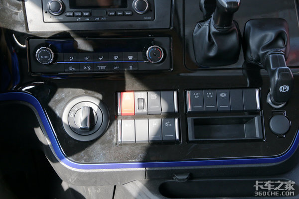 同时升级的不只按键本身,其所支持的功能也同样丰富,从左至右依次为危险报警灯开关、节油开关、油箱加热开关,下一行从左至右为电/气喇叭转换开关,轴间差速锁锁止按钮。
