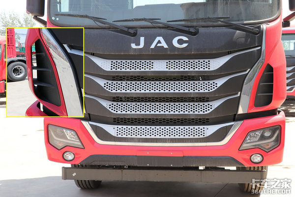 虽然装配的是低矮的平顶驾驶室,但这并不影响它的颜值。采用亚光黑与银色搭配的网孔条板堆叠而来的U型前面罩,外侧包裹了镀铬的银色装饰条,整个前脸尽显奢华。两侧设计有导风槽,造型完美贴合前脸设计,且在高速行驶撞风时能够把气流导在车门表面,具有一定的清洁效果。