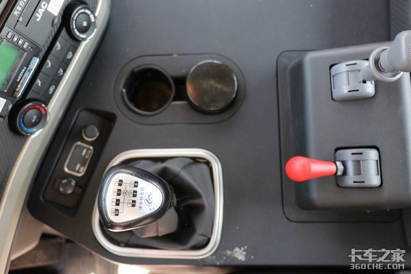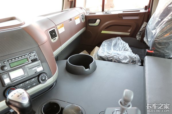 驾驶室并非平地板设计,中间却是一个凸起的大平台,看惯了现在市场上主流的平地板驾驶室后,相信很多人第一眼看到都觉得很别扭,但这对于短途运输来说问题不大,不过看着确实挺可惜。该大平台除了驾驶员侧排列的档杆以及驻车阀等常规部件外,另外就只有烟灰缸和一个大口径的杯座了。