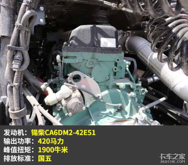 搭载的是一台11升排量的锡柴机,输出420马力,对于中短途工况来说,完全能够应付了。如果马力太大会增加购车成本,马力太小的话又有些力不从心,所以折中的动力能减少购车成本又不影响用户的效率。