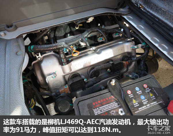 动力方面,这款车搭载的是柳机LJ469Q-AEC汽油发动机,最大输出功率为67KW,最大91马力,峰值扭矩可以达到118N.m,达到了国六排放标准,与之匹配的是5挡变速箱。