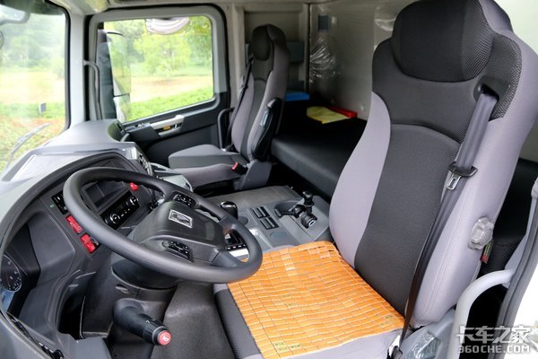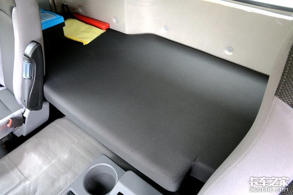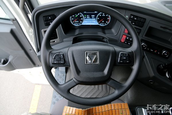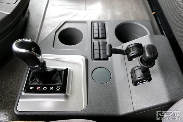 驾驶室并非平地板设计,中间是一个凸起的大平台,看惯了现在市场上主流的平地板驾驶室后,相信很多人第一眼看到都觉得很别扭。该大平台除了驾驶员侧排列的档杆以及驻车阀等常规部件外,另外还有两个大口径的杯座以及待扩展的两排功能按键。