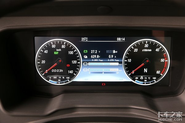 标配全液晶仪表盘,车辆大部分参数集成显现在这里,驾驶员能够对车辆的行驶状态一目了然,且仪表造型透露出了满满的科技气息,这也和其电动重卡的身份很是对应。