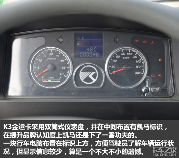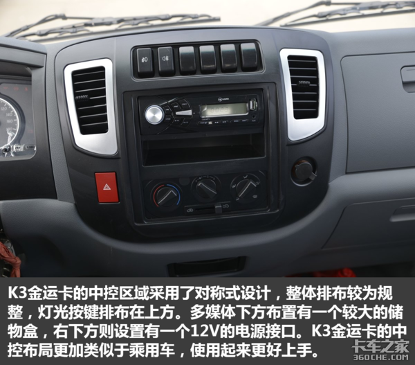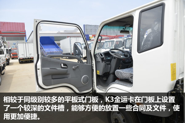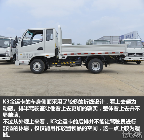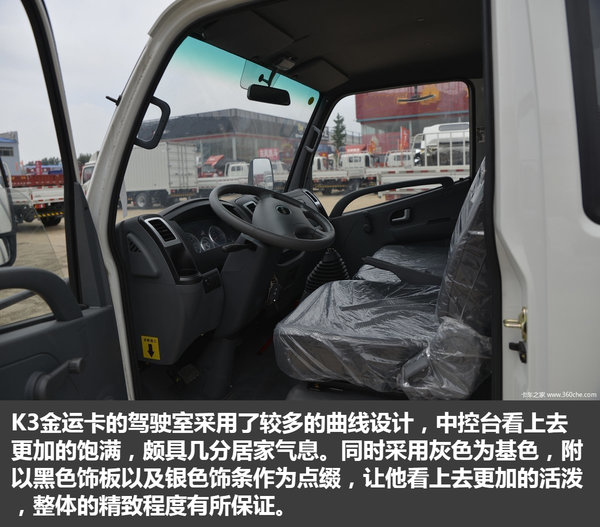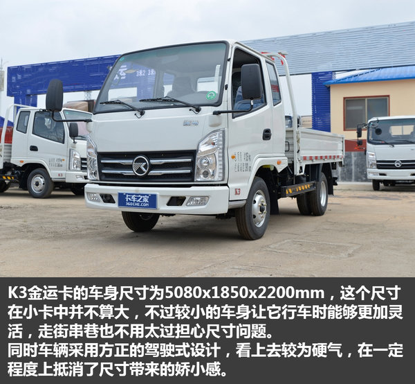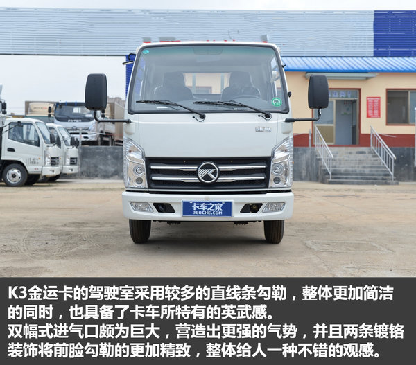 从上述图片中我们能够看出,K3金运卡在6万元价位的小卡当中属于上游水准,较为硬气的外观,稍显精致的内饰,强悍的承载能力以及不错的动力水平,无疑不显示着这是一款物美价廉的产品。如果您是一个刚刚进入运输行业,想要从事城乡运输配送,这款车可以说是相当实惠的选择。(文/杨荣韬 图/卡车之家)