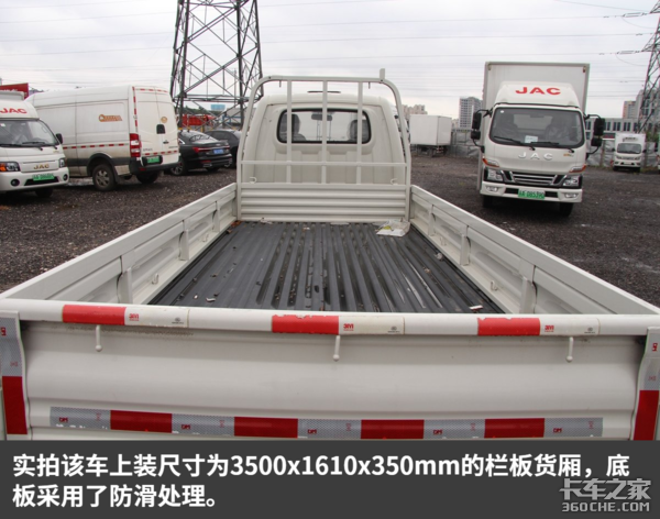 本次实拍该车为2019款帅铃i3-X280三米五单排纯电动栏板轻卡,车辆车身尺寸为5560x1710x2090mm,上3.2吨的公告。