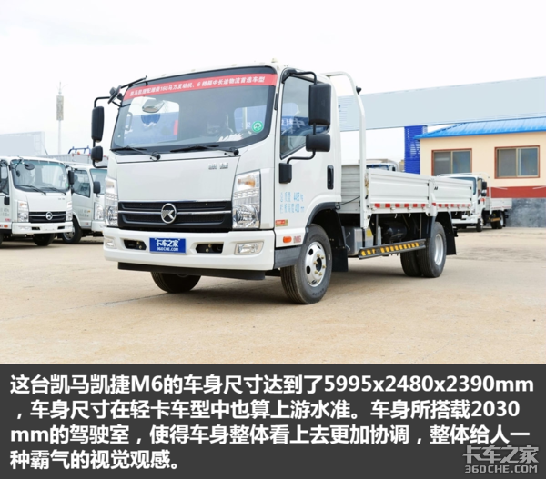 这台凯捷M6轻卡不仅动力十分充裕,同时底盘承载能力也值得称赞。外观看上去则更具力量感,内饰设计更加贴近乘用车,整体让人心生好感。并且作为亲民的汽车品牌,这款搭载160马力的凯捷M6仅需10万元出头就能开回家,可以说极具性价比。如果您更在意产品的性价比,且想要一台能够满足中长途货物运输的车辆,这款车应该是一个不错的选择。(文/杨荣韬 图/卡车之家)