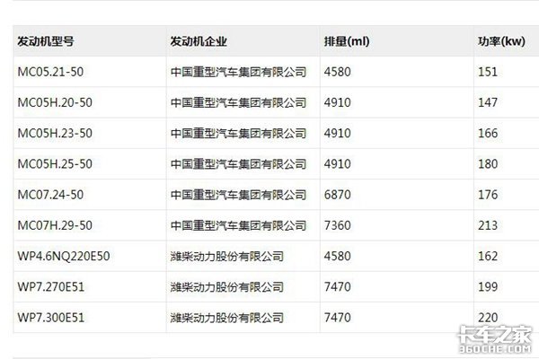 在动力部分,国五公告有9款发动机,包括重汽MC系列和潍柴WP系列,排量覆盖4.58升至7.47升。动力最大的版本来自潍柴WP7系列,最大功率达到300马力,和现有车型相比有一定突破。