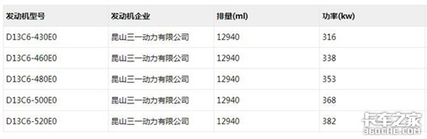 国六公告(HQC13105Q1S13F)新车搭载三一道依茨D13系列发动机,排量为12.94升,有430、460、480、500、520马力段可选。