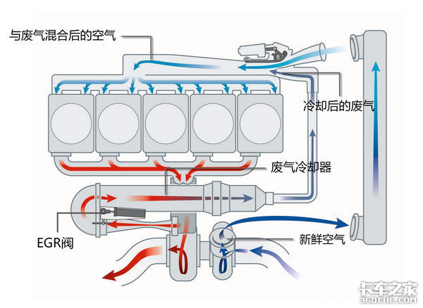 由于在高温富氧下,氧气会和氮气反应生成NOx(氮氧化物),通过将发动机废气引入汽缸降低汽缸温度,能有效减少NOx的排放。经EGR技术后排放出尾气的NOx含量,会比直接排出的尾气降低30%-50%左右。