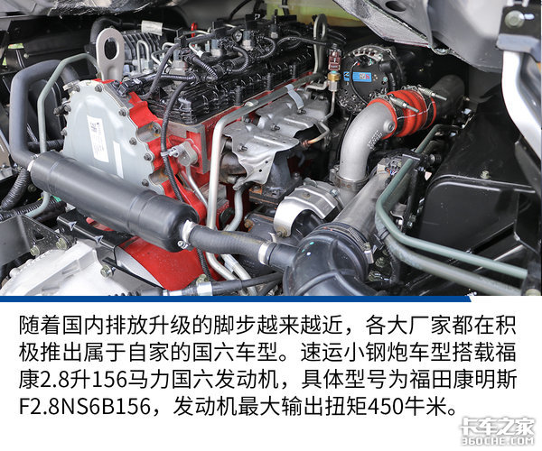 从速运小钢炮整车配置来看,它以车辆技术成熟可靠为主基调,并在此基础上对车辆的动力性、安全性和舒适性方面都进行了优化。与此同时国六动力的装配,能够让车辆在满足法规要求的同时拥有更好的燃油经济性,再加上其还拥有着较轻的整车自重,完全能够让用户远离排放法规严查和超载上不了牌的尴尬境地。(文/图 王超鹏)