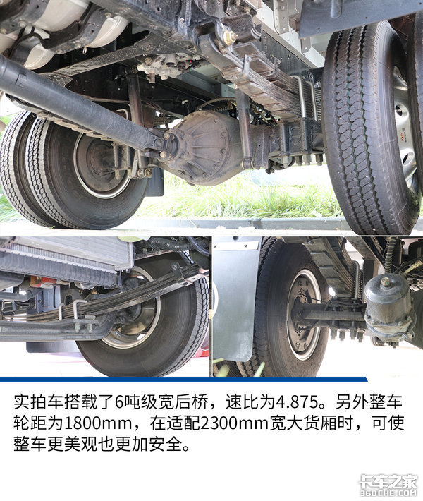 同时整车采用前盘后鼓式制动系统,制动效率更高效,并且为了能够同时兼顾舒适性和承载性,实拍车采用了前3后8+6片板簧的悬架设计。