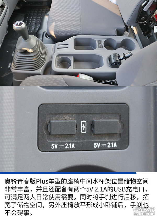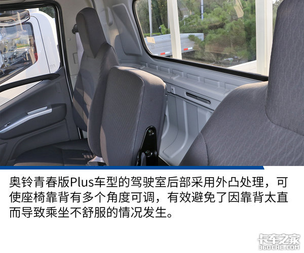 实拍车在驾驶室内部空间方面还有一个非常人性化的小设计,我们都知道有的轻卡驾驶室非常窄,靠背不能大角度的调节,总是直直的,坐起来非常不舒服。而奥铃青春版Plus车型的驾驶室后部采用外凸处理,可使座椅靠背有多个角度可调,有效避免了因靠背太直而导致乘坐不舒服的情况发生。