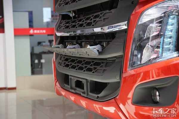 另外还有一个小细节我个人比较喜欢,那就是前面罩上部和下部都有一根镀铬的装饰条,这两条装饰条提升了整个驾驶室前部的层次感。再加上保险杠有一些分层设计,整个前脸就显得很有设计感,识别度很高,让人过目难忘。
