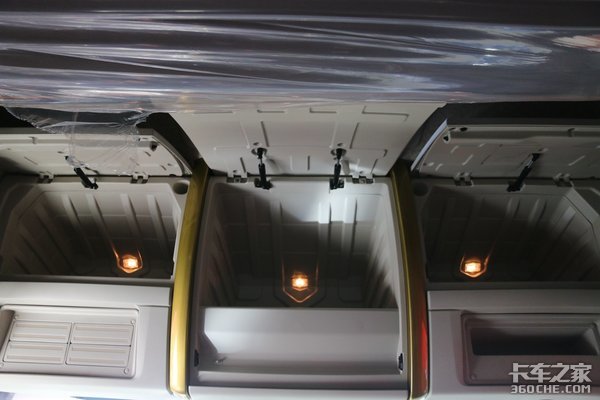 内饰其他方面也有一些小细节的升级,中控台、车门板、驾驶室顶部的储物箱等地方都增加了金色的装饰条,可以提升整个驾驶室的逼格,让人看上去感觉驾驶室更加豪华,同时也更具层次感。