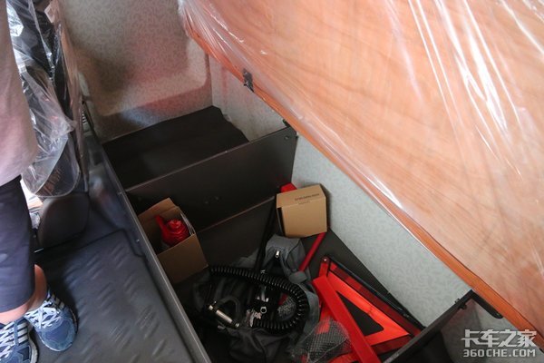 提及储物空间,乘龙H7的驾驶室内部储物空间在同级别中绝对算得上是上流水平,卧铺可以直接翻转过来,在卧铺下面有三个比较大的储物箱。另外就是驾驶室顶部有三个储物箱,放置衣物之类的东西完全够用了。