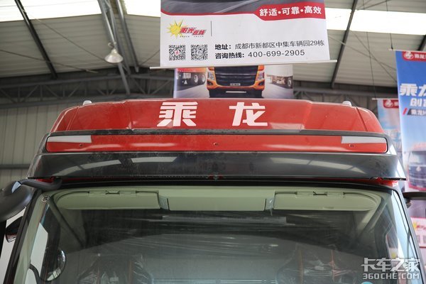 顶部的“乘龙”字体,表明了这台车的出身,前挡风玻璃上面的遮阳板同样是红黑双色的搭配,非常的靓眼。而且遮阳板还可以给驾乘人员提供一定的遮阳作用,以降低阳光直射给驾驶员带来的视觉盲区,提升安全性。另外这遮阳板还有一个作用就是提升颜值,如果取消遮阳板,就像是一个没有眉毛的美女一样。