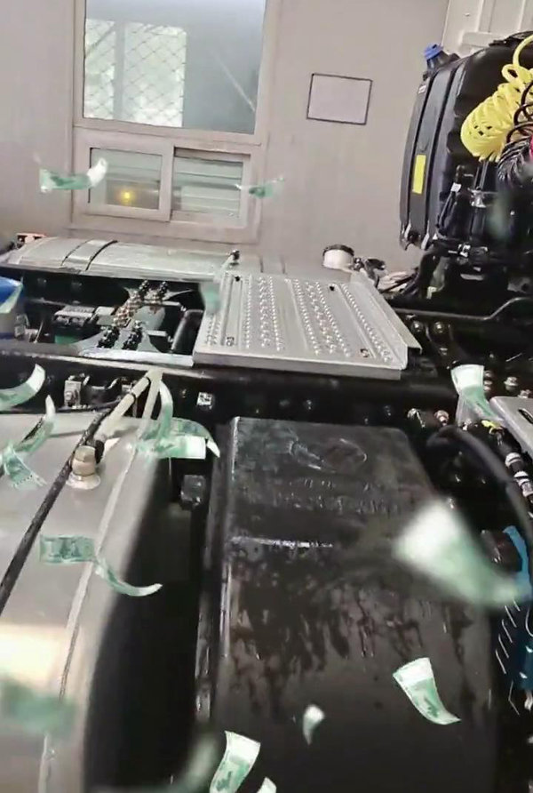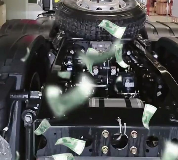 通过视频发现,该车后桥采用的是气囊悬架,但并没有带后桥提升功能,仍然是6x4驱动形式。红色的发动机外观,应该搭载的还是福田康明斯X系列国六排放发动机,猜测采埃孚AMT、液缓之类的配置也会出现在该车上。