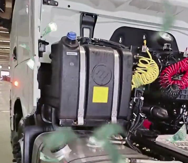 车身两侧并没有给尿素罐留出位置,可以看到,它被移到了驾驶室左后侧,体积很大,能够满足长时间使用。从视频中侧面可以看到,车桥应该是采用了免维护轮端,猜测还是康迈品牌。