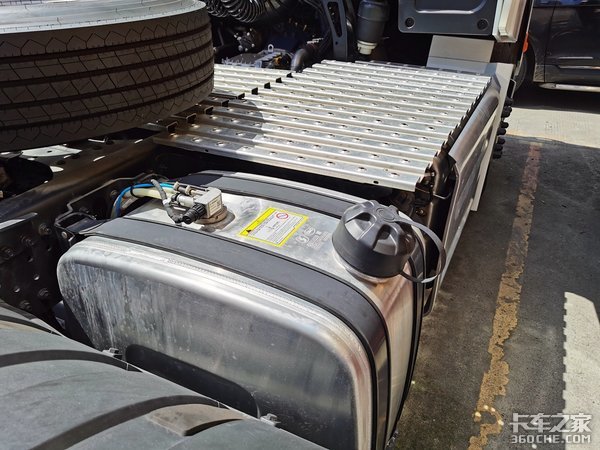 我们实拍的这台车装配了双油箱,车架左侧是一个800L左右的油箱,油箱上还带有登车梯,方便驾驶员上下后部的工作台。右侧则是一个小容积的副油箱和后处理,以及尿素罐,因为这台车是国六标准,所以后处理体积很大。