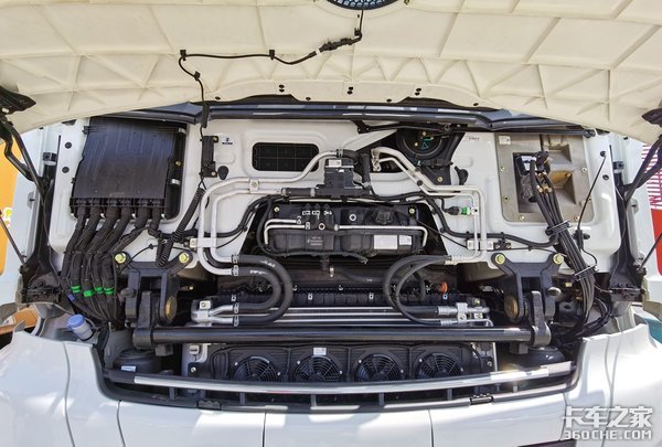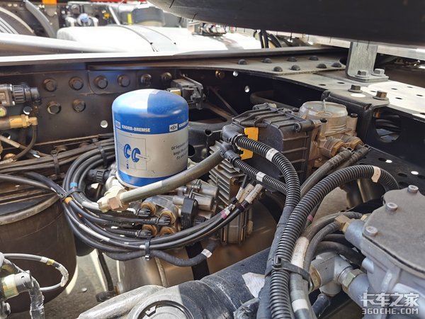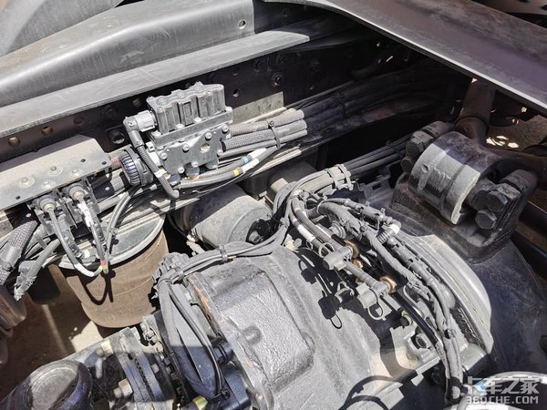 陕汽之前的产品底盘管线的布局一直都比较随意,而这台X6000则完全不一样,底盘所有的管线布局非常规整有,所有的管线的走向、包扎都非常讲究,和进口车有得一拼。而且随着车辆电气化程度越来越高以后,管线的复杂程度也越来越大。稍有不慎那条电缆磨破或者是气管漏气,都可能造成整车不正常。