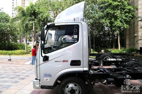 这款车货箱形式为厢式,可装配货箱尺寸为4140mm×2100mm×2100mm,轴距为3360mm,可以上蓝牌,符合目前主流轻卡标准。