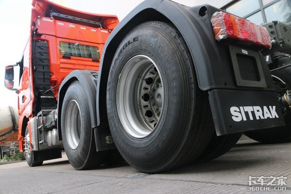 轻量化轮圈:前轮为铝合金材质,后轮是旋风车轮,合计降重61.6kg。(轮胎型号:12R22.5)