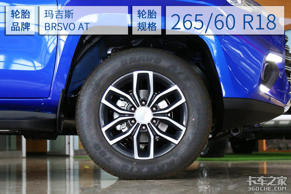 双色双辐条铝合金轮圈造型别致,车辆使用了玛吉斯AT轮胎,规格为265/60 R18。